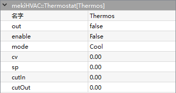 Thermostat provides basic thermostatic (on/off) control with a statusBoolean out property and statusNumeric inputs for controlled variable (Cv), set point (Sp), and differential (Diff). Default action is cool.
